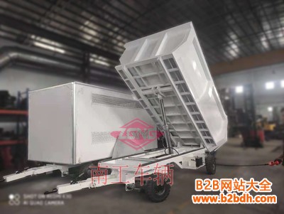 自卸车的车厢分后向倾翻和侧向倾翻两种,通过操纵系统控制活塞杆运动,后向倾翻较普遍,推动活塞杆使车厢倾翻,本拖车是向后方倾翻,无动力以叉车或牵引车牵引行走。